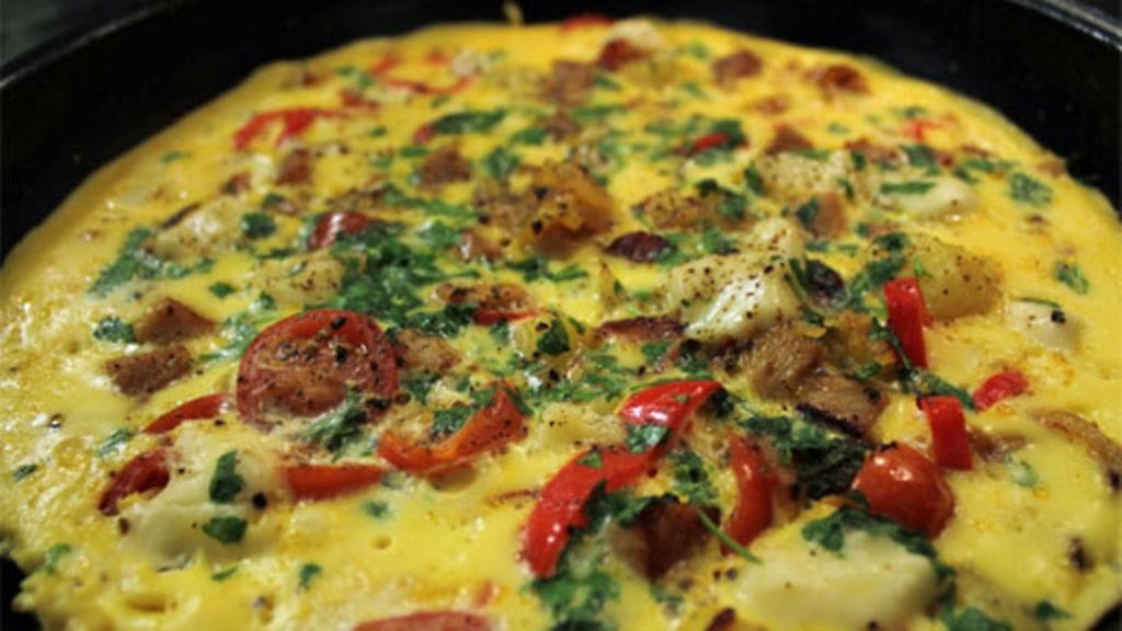 Laita pilkotut pekonit kylmälle pannulle ja nosta sitten lämpöä hieman yli keskilämmön, että pekoni paahtuu rauhassa rapeaksi. Kun pekoni on rapeaa, lisää kinkun palaset, sipulit ja keitetyt perunat. Freesaa aineksia hetki ja lisää mukaan pilkotut tomaatit ja paprikat.