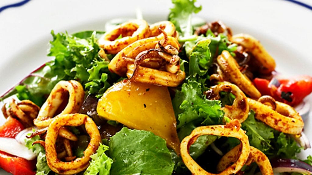 3. Sekoita cayenne, paprikajauhe ja suola keskenään. Paista mustekaloja, joihin olet ripotellut puolet maustesuolasta, oliiviöljyssä minuutin ajan, sekoita. Siirrä mustekalat kulhoon vihannesten päälle. Sekoita viinietikka, oliiviöljy ja loput maustesuolasta ja tiputtele salaatin päälle. Tarjoile heti.