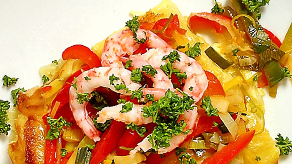 3. Suikaloi paprika. Kuori ja hienonna puolikas sipuli. Puhdista ja suikaloi purjo. Kuullota paprikaa, sipulia ja purjoa. Mausta suolalla ja pippurilla. Hienonna persilja ja kuori katkaravut. Aseta vihannekset tortillan päälle ja ripottele pinnalle persiljaa. Koristele katkaravuin.