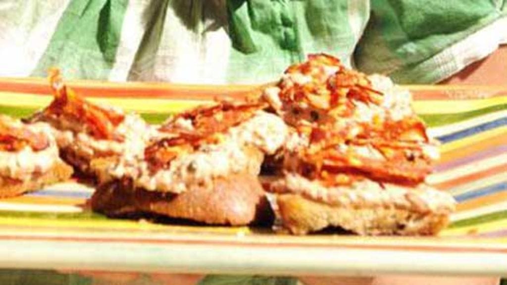 Lisää tonnikalatäytettä leipäpalojen päälle ja koristele leivät suikaloidulla chorizomakkaralla.