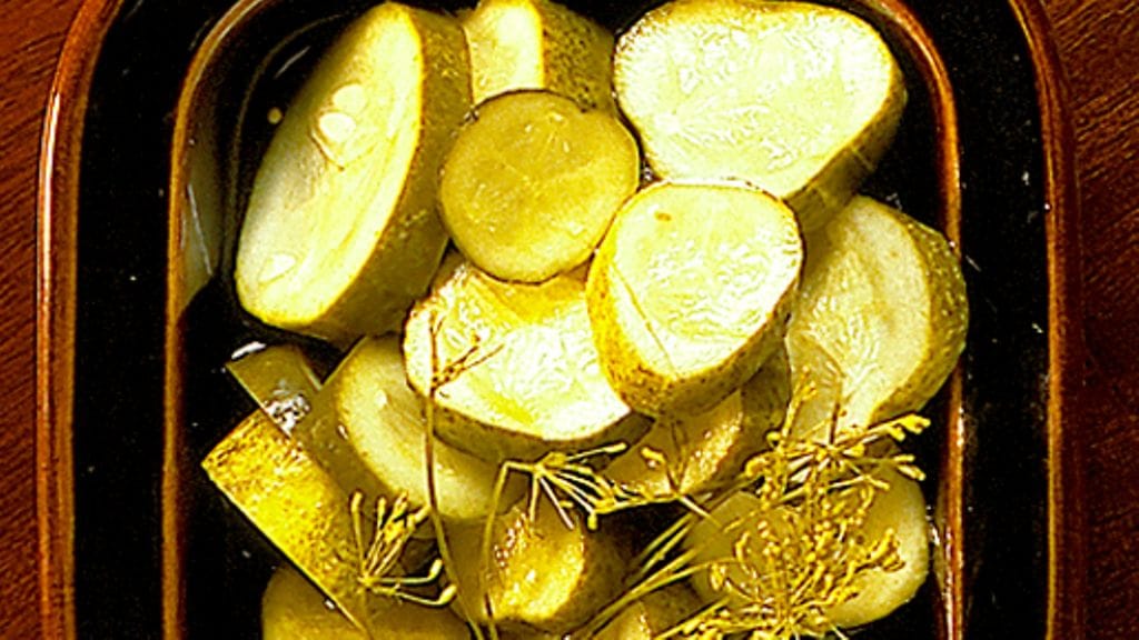 1. Huuhtele kurkut huolellisesti ja leikkaa ne ½ cm paksuisiksi viipaleiksi. Lado kurkkuviipaleet tillit ja sinapinsiemenet kerroksittain suureen lasipurkkiin.