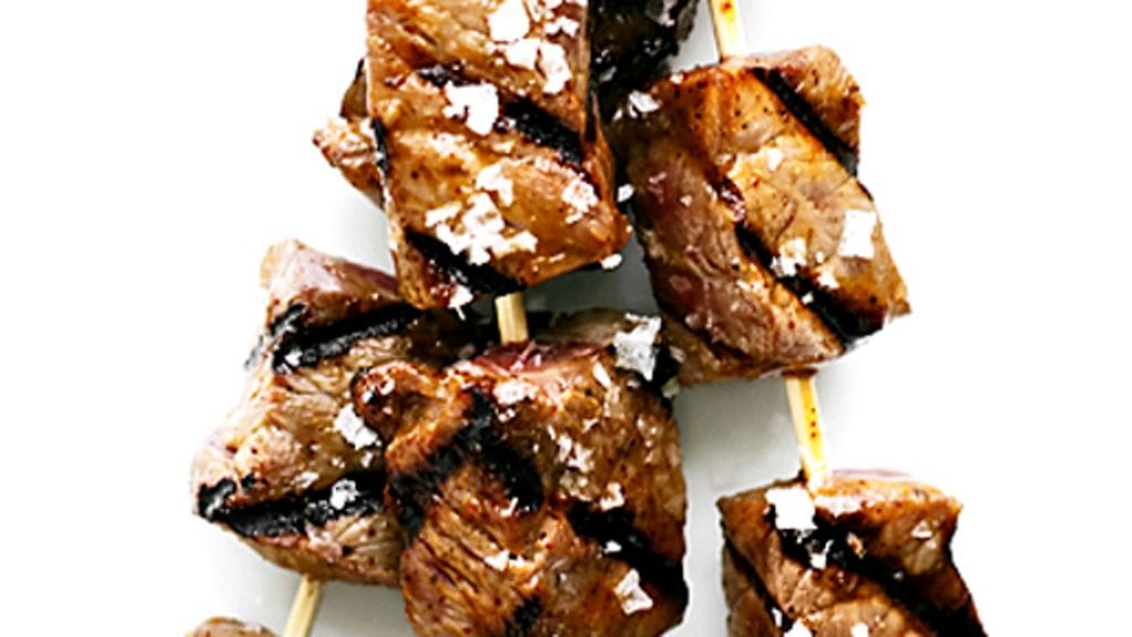 2. Pane vartaat likoamaan. Pujottele pihvilihat vartaisiin ja mausta suolalla ja pippurilla.