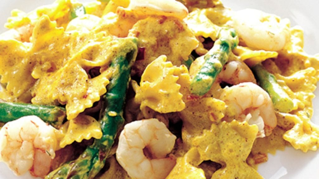 3. Kuullota curry ja kuutioidut vihannekset voissa, lisää kalafondi ja keitä kokoon, kunnes nesteestä on puolet jäljellä. Lisää joukkoon kookosmaito ja kiehauta, mausta suolalla ja pippurilla. Lämmitä scampit kastikkeessa. Sekoita kastike vastakeitetyn pastan ja parsan kanssa.