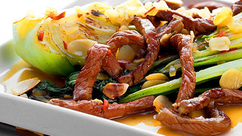 2. Kuullota pinaattia öljytilkassa ja nosta ne sitten sivuun. Paista sipulisilppu ja pihvisuikaleet, mausta chilisilpulla, kajennella, suolalla ja valkopippurilla. Lisää valkosipulinkynsiviipaleet paistumaan mukaan hetkeksi. Liuota maizena vesitilkkaan ja sekoita suurus lihaliemeen, kaada seos edellisten joukkoon pannulle, sekoita ja anna kiehahtaa.