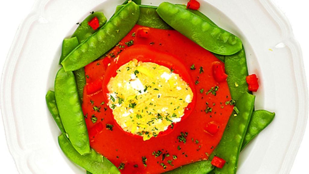 3. Tomaattikastike: Hienonna sipuli ja kuullota se öljyssä. Lisää joukkoon tomaattimurska ja basilika. Hauduta 8 minuuttia ja mausta sitten sokerilla, viinietikalla, suolalla ja pippurilla. Sekoita kastike sauvasekoittimella kuohkeaksi.