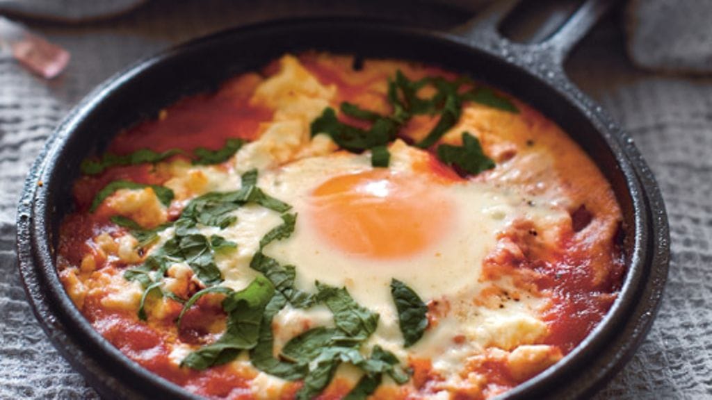 Hienonna sipuli ja kuullota sitä oliiviöljyssä pienessä valurautapannussa. Kaada joukkoon tomaattimurska ja mausteet ja anna hautua hetki. Riko päälle kananmuna ja murenna feta. Siirrä pannu 225-asteiseen uuniin. Paista, kunnes valkuainen on hyytynyt eli noin 10 minuuttia. Hienonna päälle tuoretta minttua.