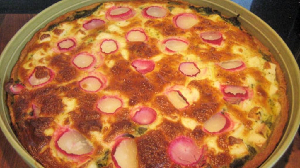Sekoita munat ja kerma, mausta. Kaada seos vuokaan. Leikkaa retiisit ohuiksi viipaleiksi pestyine punaisine kuorineen. Laita piirakan päälle kauniisti.