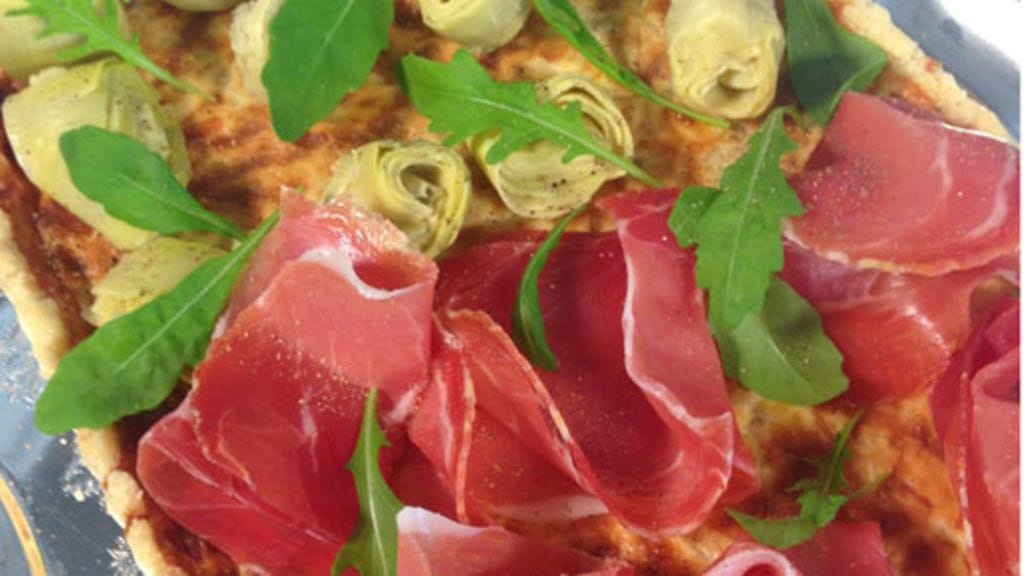 Asettele piirakan pinnalle ilmakuivattua kinkkua ja/tai artisokan sydämiä. Viimeistele rucolalla.