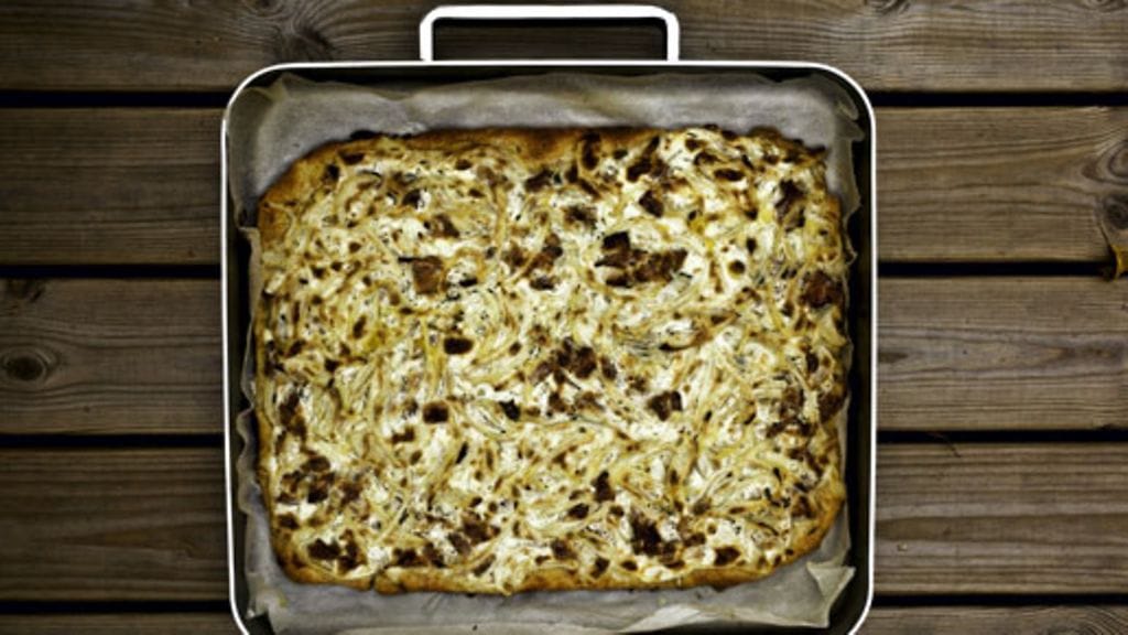 Levitä seos pohjataikinan päälle. Paista kuumassa 250-asteisessa uunissa 10–15 minuuttia.