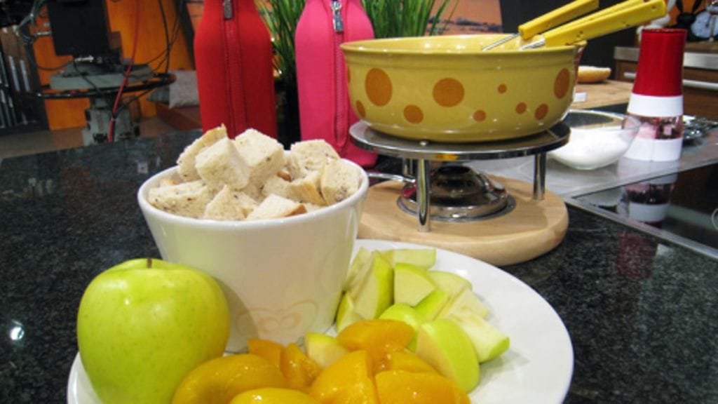 Pidä fonduepataa miedolla lämmöllä ja dippaile siihen vaaleita leipäkuutioita. Tarjoa fonduen kansssa raikkaita hedelmiä.