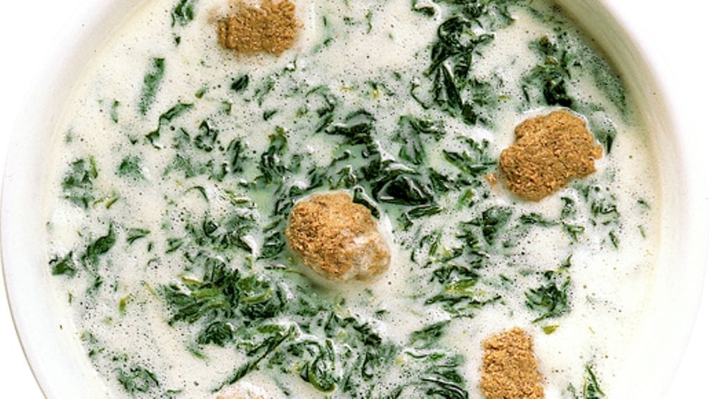 3. Vatkaa 1½ dl lientä munaseokseen ja kaada seos padassa olevan liemen sekaan. Hauduta miedolla lämmöllä 5 minuuttia kokoajan vatkaten. Keitto ei saa kiehua, sillä silloin muna hyytyy. Sekoita pinaatti keittoon ja lisää frikadellit. Tarjoa keitto välittömästi.