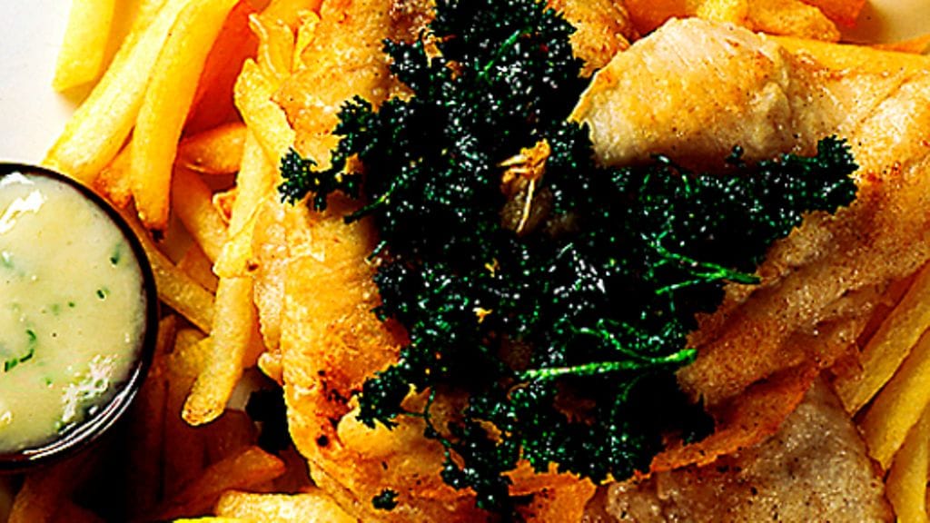 1. Frityyritaikina: Sekoita keskenään vehnä- ja perunajauho kulhossa. Lisää jauhoihin olut vähitellen ja sekoittaen. Mausta suolalla ja pippurilla. Kuumenna uuni 100 asteeseen. Kuori perunat ja leikkaa suikaleiksi, huuhtele tarkoin kylmässä vedessä, jotta tärkkelys poistuu pinnalta. Kuivaa hyvin suikaleet puhtaalla pyyhkeellä.
