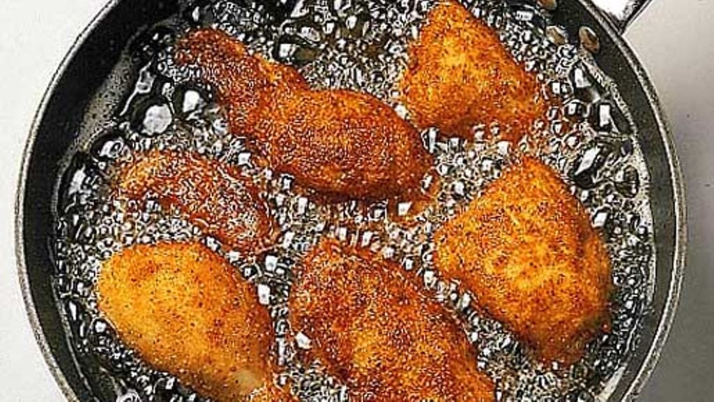 3. Kaada öljy pannuun ja kuumenna varovasti. Laita kanapalat pannuun, kun öljy on kuumaa, alenna lämpöä ja anna palasten ruskistua vähitellen. Käännä ne kerran. Riippuen palasten koosta ne friteerautuvat 5-8 minuutissa.