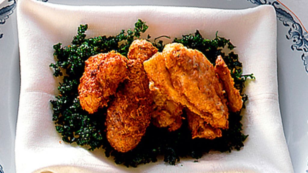2. Kuumenna friteerausröljy 160-asteiseksi. Friteeraa broilerinpaloja nahkapuoli alaspäin ja anna palojen ruskistua hiljalleen. Käännä ne kerran. Friteeraa niin kauan, että palojen pinta on rapea ja kova. Valuta friteeratut palat talouspaperilla ja nosta ne sitten lämpimälle tarjoiluvadille.