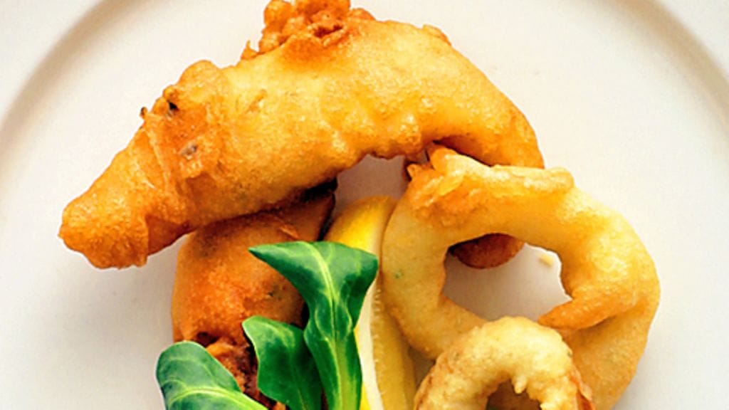 2. Leikkaa kalafileet viistosti 10 cm kokoisiksi paloiksi. Marinoi sitruunamehulla, pippurilla ja hienonnetulla persiljalla. Ripottele frityyritaikinaan ruokasooda juuri ennen käyttöä ja sekoita hyvin. Ripottele kaloille hieman suolaa ja jauhoja ja kasta palat taikinaan. Kuumenna öljy 165 asteeseen. Friteeraa kalat rapeaksi ja valuta talouspaperin päällä. Tee samoin mustekalarenkaille.