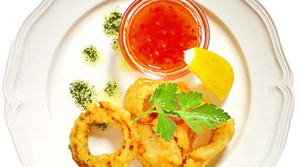 2. Paloittele kalafileet viistosti 10 cm kokoisiksi paloiksi. Marinoi sitruunamehulla, pippurilla ja hienonnetulla persiljalla. Ripottele sooda taikinaan juuri ennen käyttöä ja sekoita hyvin. Ripottele kaloille hieman suolaa ja jauhoja ja kasta ne taikinaan. Kuumenna öljy 165 asteeseen. Friteeraa kalat rapeiksi ja valuta talouspaperilla. Toista sama mustekalarenkaille.