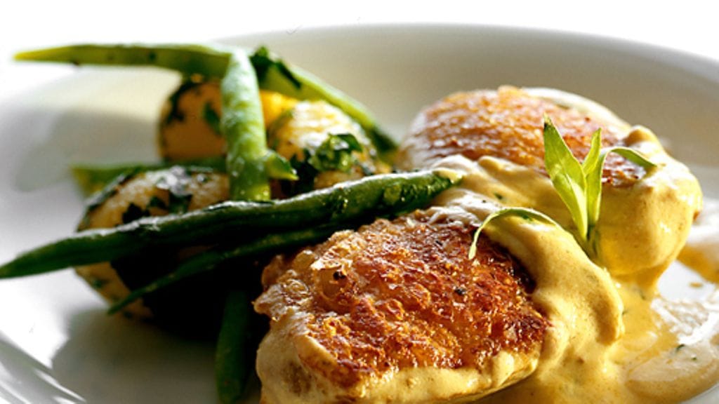 1. Paneeraa broilerinfileet ensin vehnäjauhossa, sitten vatkatussa munassa ja lopuksi korppujauhossa. Laita ne hetkeksi jääkaappiin, jotta leivitys tarttuu kunnolla. Mausta fileet suolalla ja pippurilla.