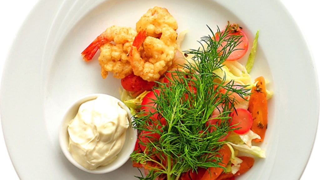 2. Katkaravut: Kuori katkaravut, mutta jätä pyrstön kärki paikalleen. Sekoita vehnäjauhot, leivinjauhe, suola ja korppujauhot. Lisää munankeltuaiset ja vesi kokoajan sekoittaen. Anna seoksen vetäytyä ja turvota vähintään 10 minuuttia. Kuumenna öljy 180 asteeseen. Kostuta katkaravut seoksessa ja friteeraa pienissä erissä.