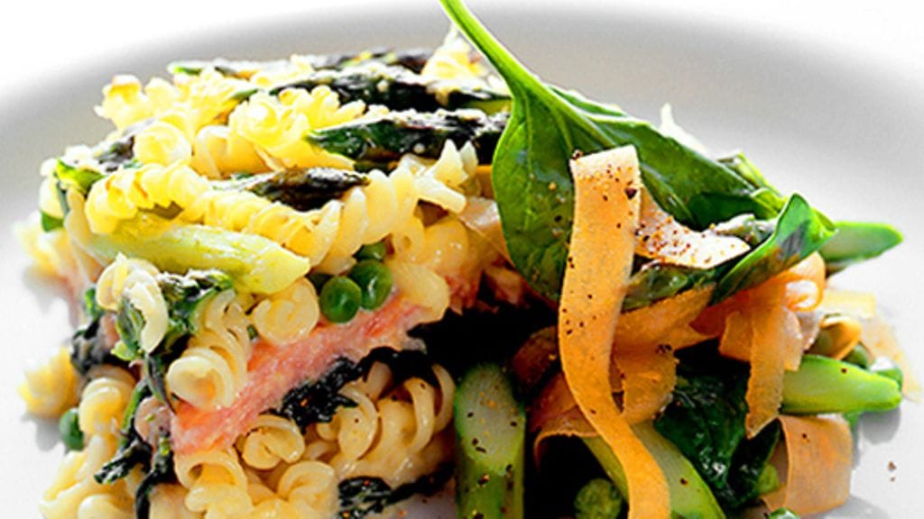 3. Sekoita yhteen pasta, lohi, pinaatti ja herneet. Laita porkkanasuikaleet päälle ja jauha mustapippuria myllystä.