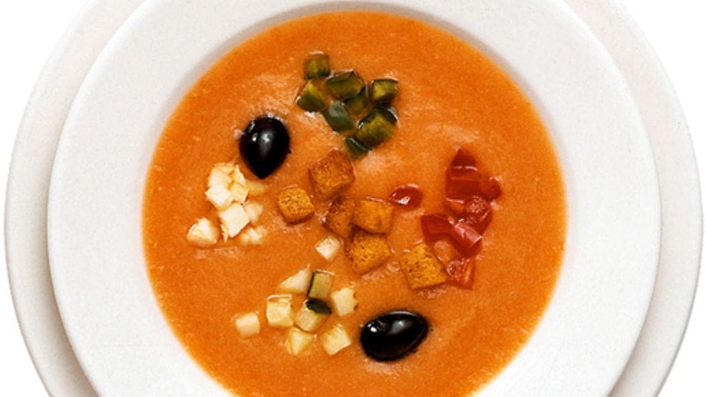 1. Kalttaa tomaatit, halkaise ne ja poista siemenet. Halkaise paprikat ja poista siemenet. Leikkaa paprikat, kurkku ja tomaatit pieniksi kuutioiksi. Silppua sipuli, ruohosipuli ja persilja, valmistele samalla myös vihannekset ja yrtit tarjoiluun. Laita tarjoiluun tulevat ainekset erillisiin kulhoihin ja pane kylmään.