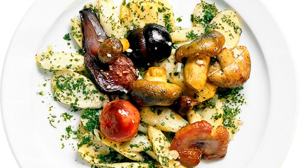 3. Puhdista sienet ja paloittele suurimmat. Kuumenna pannulla 2 rkl voita ja paista sieniä hetki. Mausta suolalla ja vastajauhetulla valkopippurilla. Annostele juuripersiljan juuret lämpimille lautasille, lusikoi sienet juuripedille ja ripottele päälle raakaa salottisipulia.