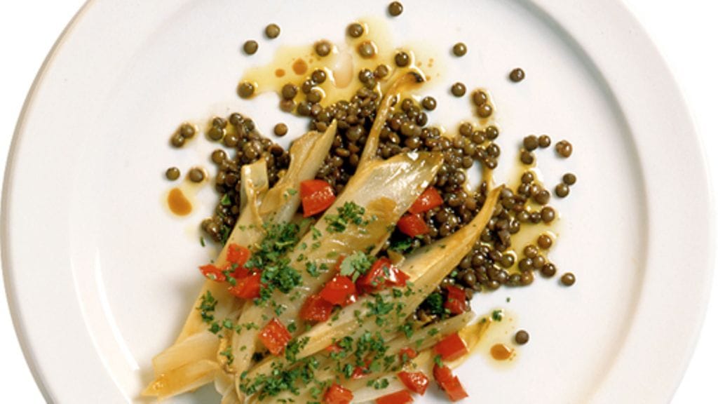 3. Valuta linssit ja jaa ne neljälle lautaselle. Asettele endiivit ja paprikat keskelle, ripottele päälle persiljaa. Mausta viinietikka suolalla ja vastajauhetulla pippurilla, lisää öljy ja kaada kastike linsseille.