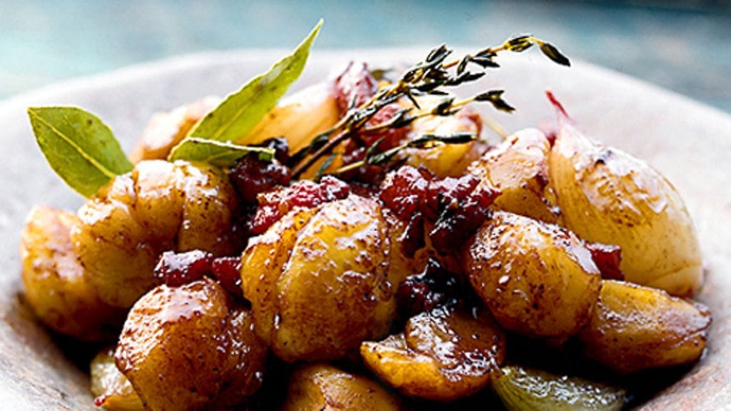 1. Kuori sipulit ja laita ne kattilaan. Peitä vedellä ja suolaa. Lisää voi, sokeri, laakerinlehdet ja timjami. Kuumenna kiehuvaksi, laita kansi päälle ja alenna lämpöä. Hauduta noin 5 minuuttia. Kun seos on kiehunut kuivaksi, se alkaa glaseerautumaan.