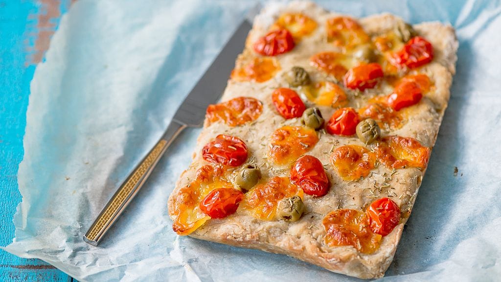 Paina päälle mozzarellapallot, puolitetut tai kokonaiset kirsikka- tai miniluumutomaatit sekä muutama oliivi ja ripottele päälle vielä hieman rosmariinia.