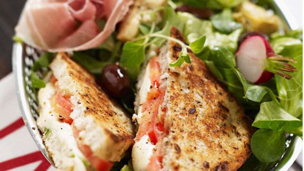 Laita päälle toinen leipäviipale ja paista hitaasti oliiviöljyssä paistin- tai grillipannulla.