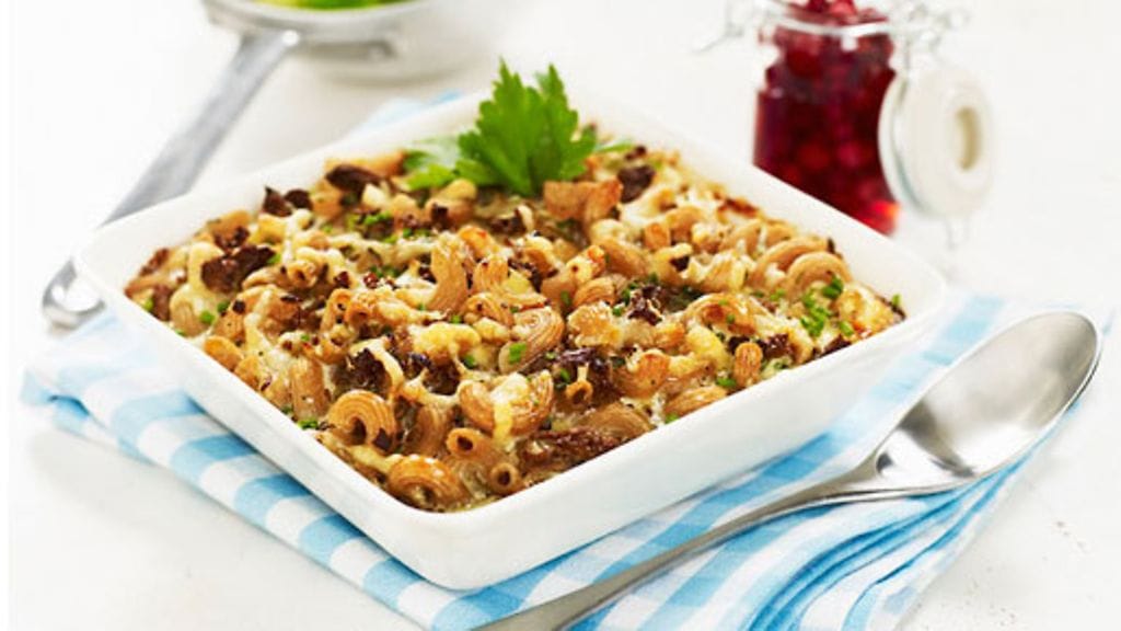 Vinkki! Jos haluat valmistaa kasvismakaronilaatikon, vaihda jauheliha esim. soijarouheesta ja kasviksista valmistettuun täytteeseen tai esim. pakastejuureksiin (n. 500 g)