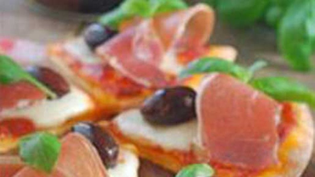 Jaa tomaattikastike kahden pizzapohjan päälle ja lisää mozzarellaviipaleet. Paista 200 °C:ssa n. 10-12 minuuttia. Jaa pizza valmiiksi kolmioiksi ja laita kunkin palasen päälle parmankinkkua, oliiveja ja basilikaa.