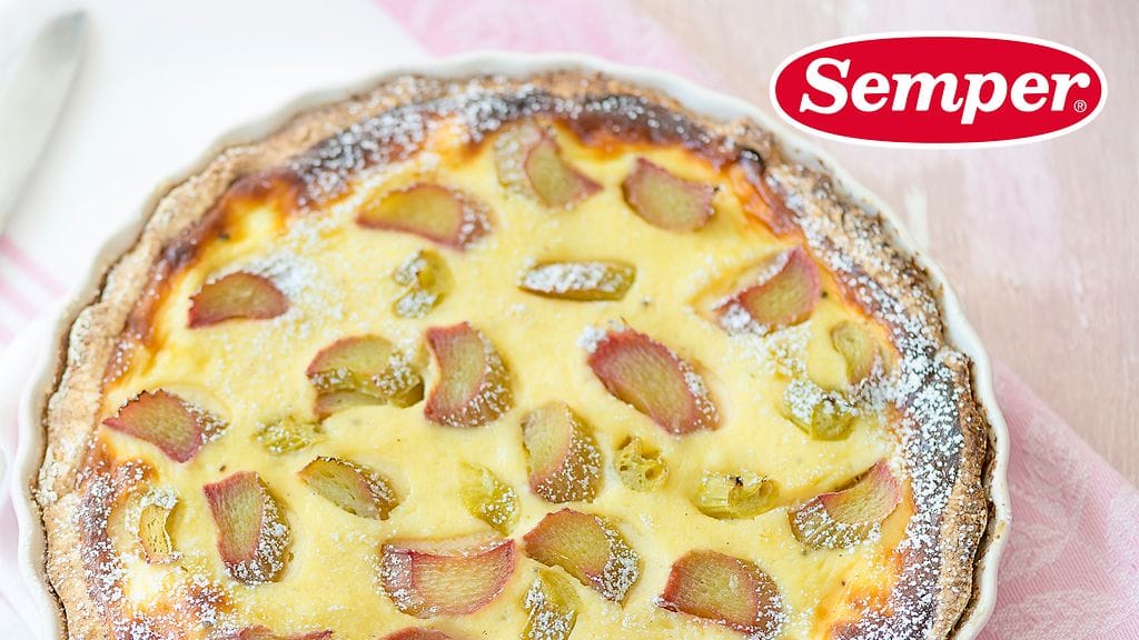 - Kaada seos esipaistetun piiraspohjan päälle ja ripottele pinnalle raparperiviipaleet ja hieman sokeria.