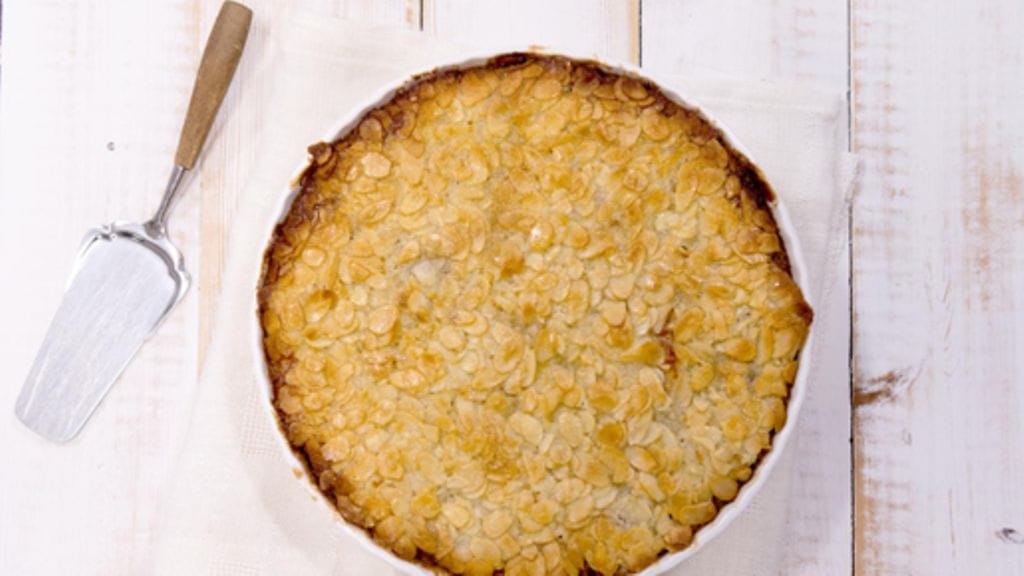 5. Mittaa kasariin voi tai margariini, sokeri, mantelilastut, gluteeniton jauhoseos ja kuohukerma tai maito. Kiehauta miedolla lämmöllä ja levitä piiraspohjan päälle.