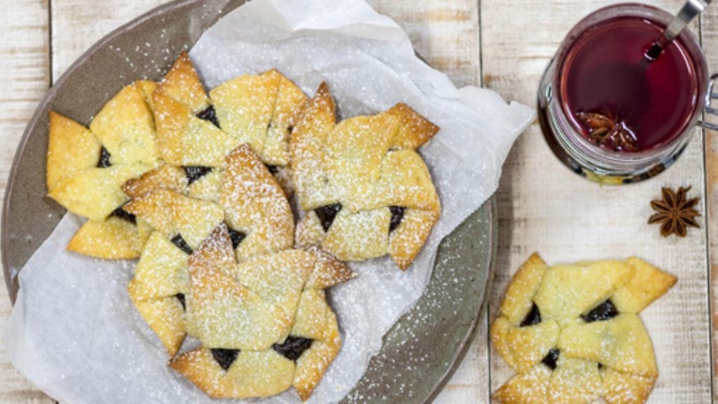 3. Jaa luumumarmeladi jokaisen neliön keskelle ja käännä sakarat keskelle luumumarmeladin päälle. Voitele halutessasi kananmunalla, saadaksesi kullanruskean paistopinnan.