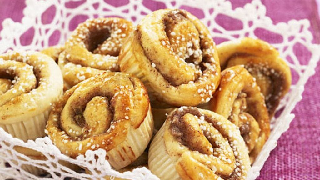 Vinkki! Voit annostella taikinan myös suoraan 20 leivosvuokaan. Paina pullan keskelle syvennys ja laita siihen 1 tl kanelitäytettä. Voitele munalla ja ripottele pinnalle raesokeria ja mantelirouhetta.