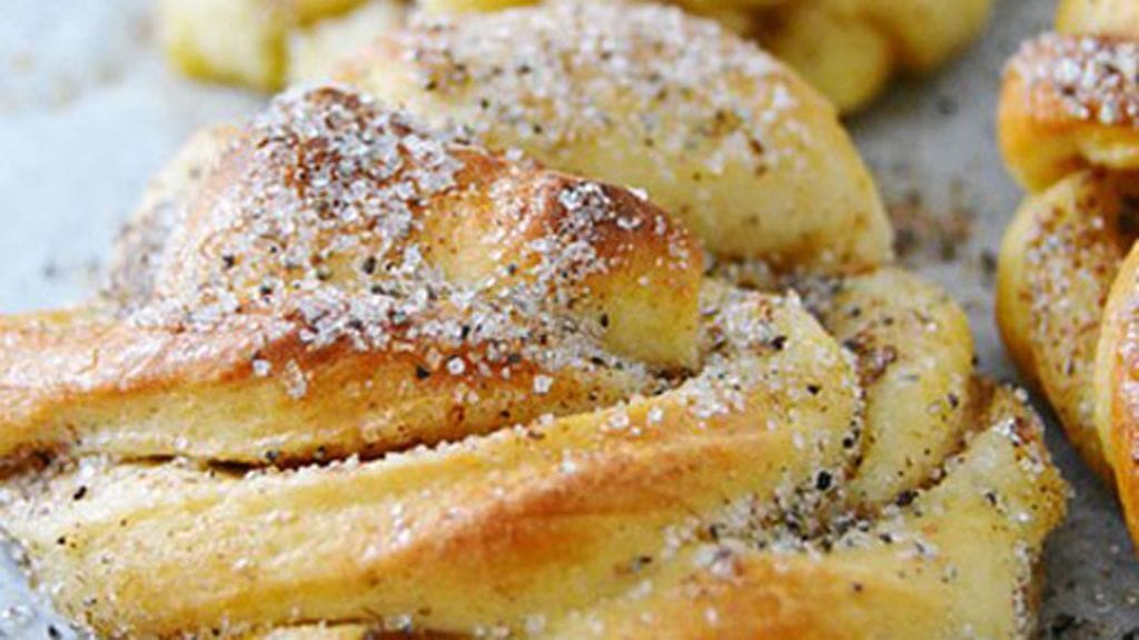 Annostele taikina paperivuokiin. Yhdistä täytteen ainekset. Paina pulla keskiosaan syvennys ja annostele siihen n. 1/2 teelusikkallinen täytettä. Kohota pellillä liinalla peitettynä n. 45 minuuttia. Voitele munalla ja ripottele pinnalle raesokeria.