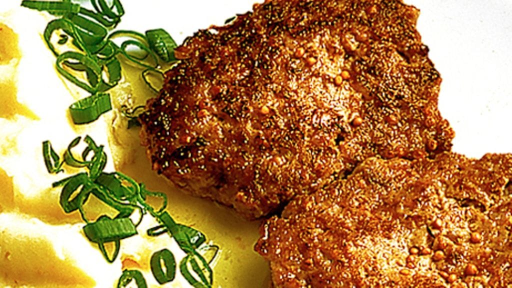 4. Muotoile taikinasta 12 pientä pihviä ja paista hitaasti ilman rasvaa teflonpannussa. Tarjoile perunamuusin ja ruohosipulin kera.