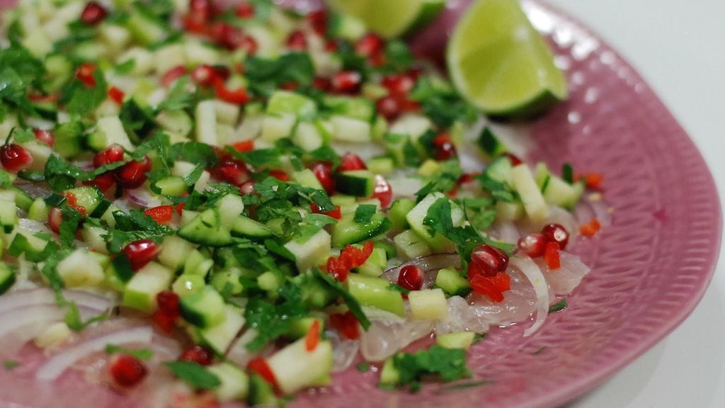 Irrota granaattiomenasta siemenet ja ripottele pinnalle. Koristele vielä muutamalla yrtillä ja purista pinnalle limettien mehu. Tarjoile hyvän leivän kera.