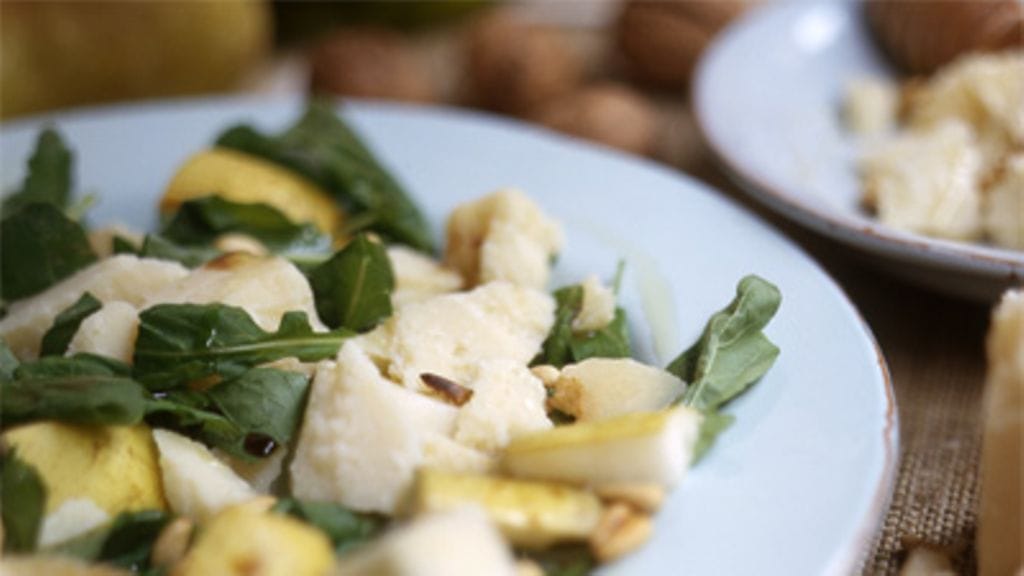 Yllättävää kyllä, mutta päärynästä, rucolasta ja grana-padanosta tulee maukas välipala, jopa pääruoka, jos annoksesta tekee tarpeeksi runsaan.