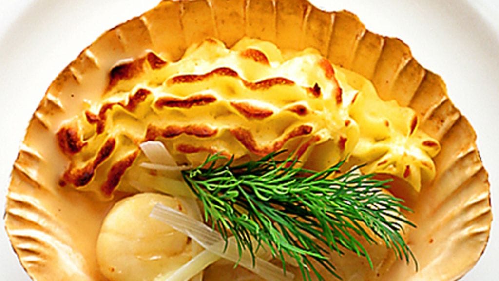 4. Pommes duchesse: Keitä perunat hyvin ja höyrytä. Muussaa perunat, lisää keltuaiset, öljy ja mausteet ja sekoita hyvin. Pursota muusi leivinpaperille pellille tai simpukoiden ympärille ja gratinoi 225 asteessa 10-15 minuuttia.