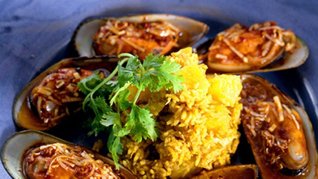 3. Kuori ja suikaloi punasipuli ohuelti. Laita sipulisuikale jokaiseen simpukkaan. Gratinoi simpukoita uunissa 3-4 minuuttia.