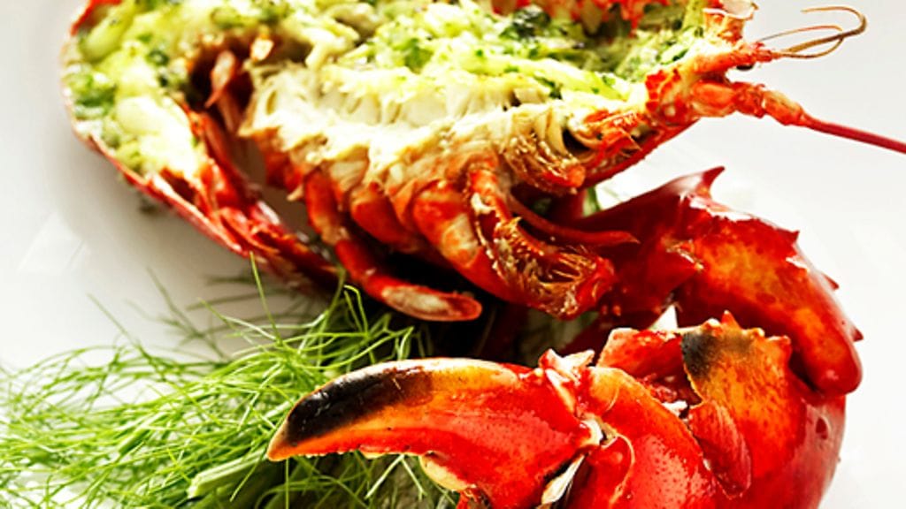 2. Kuumenna uuni 275 asteeseen, ylälämpö tai grilli. Laita hummeri leikkuulaudalle ja halkaise se kahtia isolla, terävällä veitsellä. Poista mahalaukku, joka on aivan edessä pään alaosassa. Riko saksien panssari. Levitä puolet fenkolivoista hummerinpuolikkaille. Toista sama toiselle hummerille ja nosta puolikkaat uunipellille ja gratinoi uunin ylätasolla, mielellään uuninluukku raollaan, noin 1 ½ minuuttia.