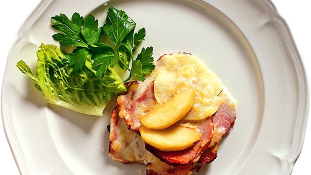 2. Viipaloi kassler. Poista omenista siemenkodat ja viipaloi omenat. Lado kassler- ja omenaviipaleita voideltuun, uuninkestävään vuokaan kerroksittain. Kaada päälle juustokastike ja ripottele pinnalle sinihomejuusto. Gratinoi uunissa 15 minuuttia.