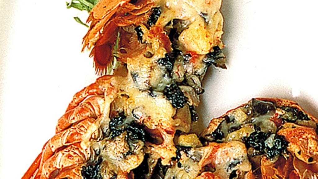 3. Sulata pannussa 1 rkl voita. Lisää hummeripalat ja anna lämmetä. Poista pannu liesituulettimen alta ja pidä pannuun sopiva kansi käsillä. Kaada konjakki hummeripalojen päälle ja sytytä palamaan. Pane kansi päälle muutaman sekunnin kuluttua, niin että tuli sammuu. Lisää hummerin lihan joukkoon korvasienimuhennos, mausta Cayennepippurilla ja sekoita joukkoon raa´at keltuaiset. Hauduta muutama minuutti hyvin alhaisella lämmöllä. Täytä hummerinkuoret muhennoksella. Sirottele pinnalle hieman korppujauhoa. Asettele täytetyt hummerinpuolikkaat uuninkestävälle vadille ja laita se 200 asteeseen uunin ylimmälle tasolle 7-8 minuutiksi, kunnes annokset saavat kauniin värin.