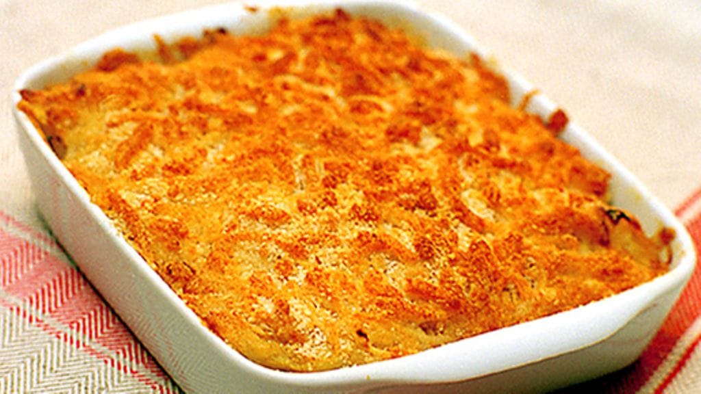 2. Levitä purjot makkaroiden päälle, laita päälle omenakuutiot. Sekoita kananmuna ja sinappi, levitä makkaroiden päälle. Sekoita korppujauhot ja juustoraaste, ripottele päällimmäiseksi.