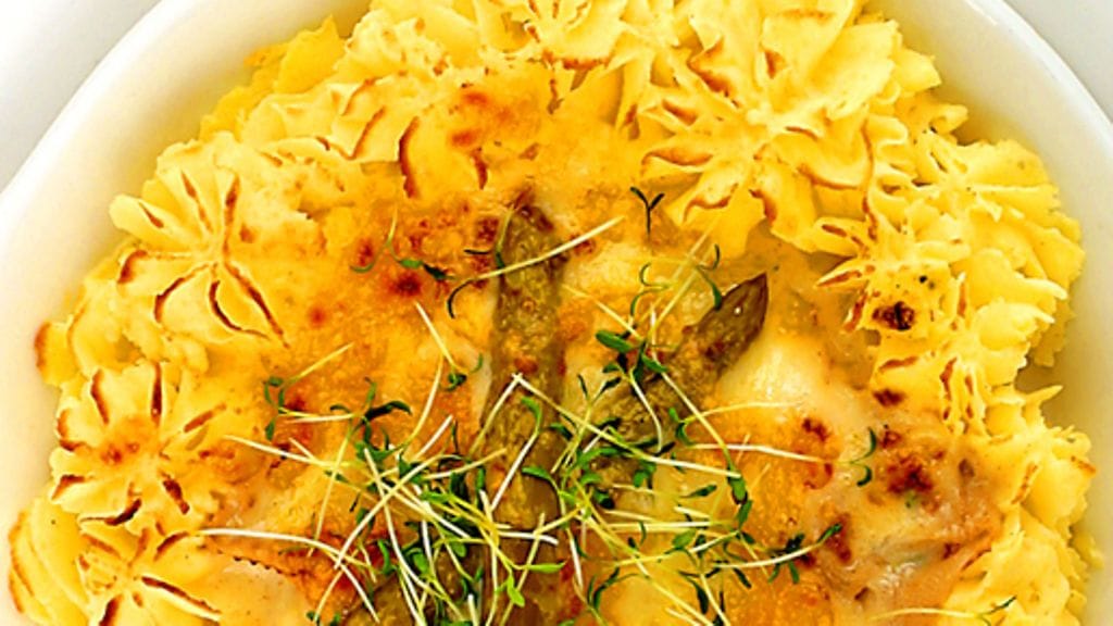 1. Pommes duchesse: Kuori ja keitä perunat, survo perunasurvimella, lisää munankeltuaiset ja voi, sekoita. Mausta suolalla ja pippurilla. Anna muusin jäähtyä ja pursota sitten pursotinpussista uuninkestävän vuoan reunoille.