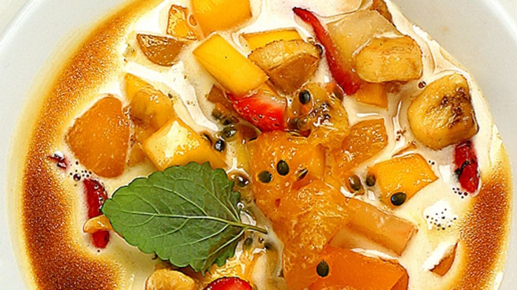 1. Lämmitä uuni 275 asteeseen. Sekoita vedestä ja sokerista sokeriliemi. Kuori päärynä, poista siitä siemenet ja paloittele se lohkoiksi. Keitä lohkoja sokeriliemessä. Poista passionhedelmistä siemenet. Paloittele ja viipaloi persikka. Kuori ja viipaloi banaani ja mango, pilko mansikat. Pane hedelmät marinoitumaan viiniin 15-20 minuutiksi.