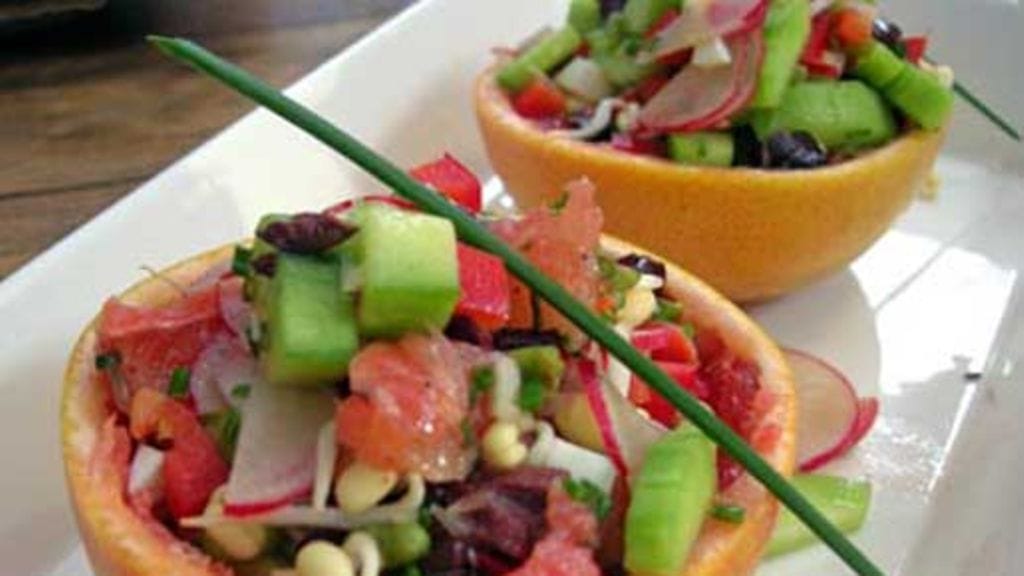 Puolita greipit ja leikkaa niistä greippiveitsellä lihat pois. Säästä kuoret. Paloittele kaksi puolikasta ja purista toisista puolikkaista mehu talteen. Leikkaa retiisit ohuiksi siivuiksi ja paprika tulitikkumaisiksi suikaleiksi. Kuori kurkku ja poista siemenet. Pilko pieniksi kuutioiksi. Murskaa haarukalla keitetty valkuaisen. Silppua ruohosipuli.