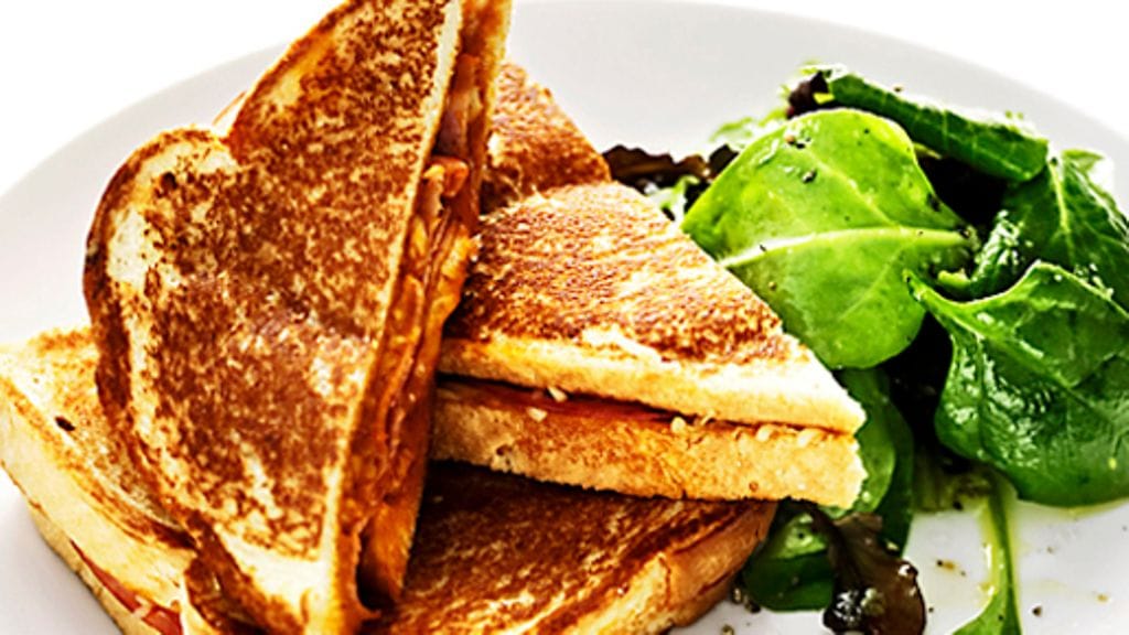 2. Voitele leipien toiset puolet voilla. Levitä työpöydälle 4 folioarkkia ja laita jokaiselle 2 leipäviipaletta, voi folioon eli alaspäin. Levitä tasainen kerros kastiketta leiville, sirottele pinnalle juustoraaste. Laita neljälle leipäviipaleelle kinkkusiivu ja nosta niiden päälle kinkuttomat leivät, juustoraastepuoli kinkkua kohti. Kääri jokainen kaksikerroksinen leipä foliopakettiin.