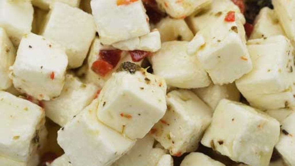 3. Asettele paprikat uuninkestävään vuokaan ja paista uunissa 25-30 minuuttia. Ota paprikat uunista ja anna jäähtyä. Koristele murustetulla fetajuustolla.